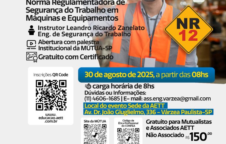 🚨 CURSO PRESENCIAL – VAGAS LIMITADAS! 🚨 Tema: NR12 – Norma Regulamentadora de Segurança do Trabalho em Máquinas e Equipamentos.